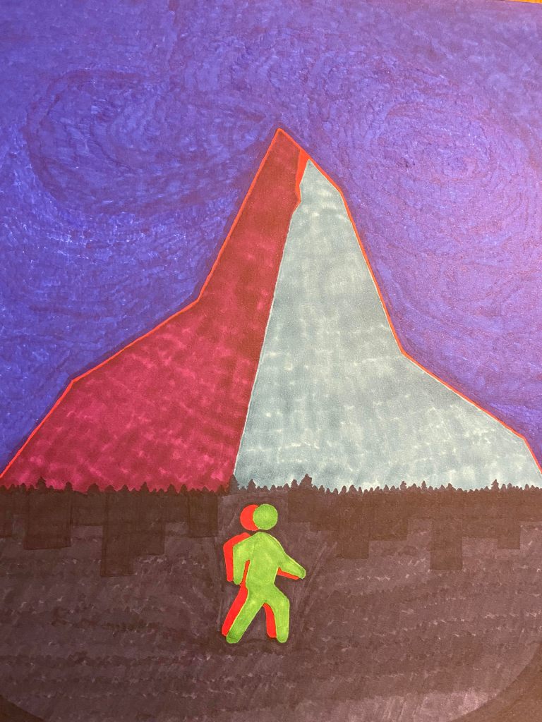 A couple weeks back, I had rough ideas for what a Razor Mountain cover might look like. First and most obvious thing: with a title like that, it pretty much has to have a mountain on the cover. Apart from that, the book is in many ways about duality: past and future, acceptance and denial, life and death, God-Speaker and Christopher. That’s not necessarily an easy concept to get across visually, but I had a vague idea of the mountain being split in half, and the shape of a person in a dark space beneath it, also split or doubled. I imagined a line down the middle, with the regular colors on one side, and a photo-negative effect across the other side.