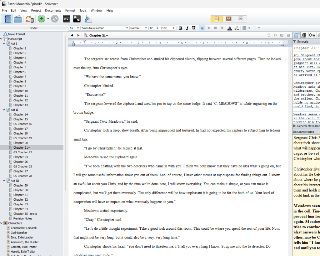 As far as I am concerned, Scrivener is the best novel-writing application out there. Where it really shines is in the way it lets me split a big project into nested parts. I split Razor Mountain into folders for each act, then split out each chapter into its own document under those folders. I have separate sections for major characters, locations and other research notes.