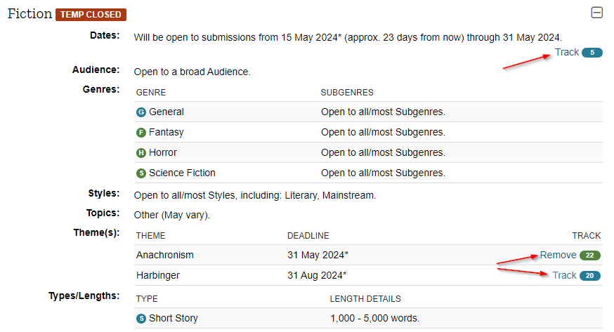 On a publisher’s detail page, general submission windows will be listed under the Dates heading, and specific themes will be listed under Theme(s). In each of these sections, there will be a Track link and a colored bubble listing the number of Duotrope users who are already tracking.