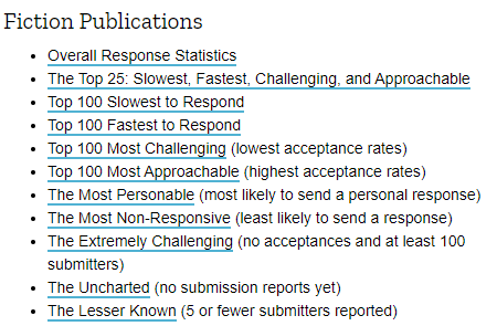 Authors who are sick of waiting for long response times can check the 100 fastest publishers to respond. Looking for feedback? Check the list of publishers most likely to send a personal response. Just trying to get a story accepted somewhere? Consider the list of publications with the highest reported acceptance rates.